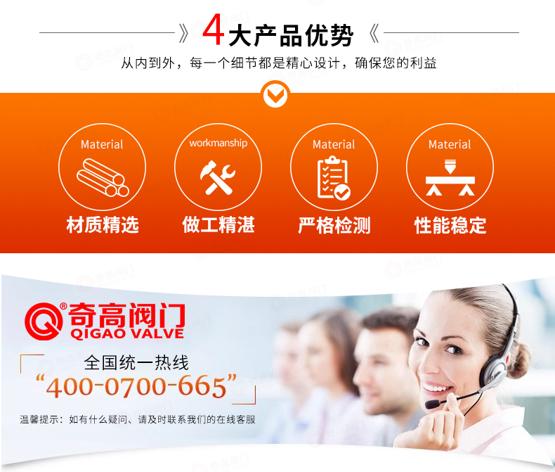 “奇高閥門”的期望,不斷提升服務(wù)質(zhì)量,精益求精,“真誠(chéng)的服務(wù)”是“奇高”永恒的主題?!捌娓摺眹?yán)格按照IS09001-2000 質(zhì)量體系認(rèn)證要求,質(zhì)量嚴(yán)格把關(guān), 責(zé)任到人,確保生產(chǎn)、銷售、服務(wù)的健康運(yùn)行。加強(qiáng)與用戶溝通,竭誠(chéng)為廣大客戶提供優(yōu)良產(chǎn)品,貼心服務(wù)。特此我廠做出以下承諾: