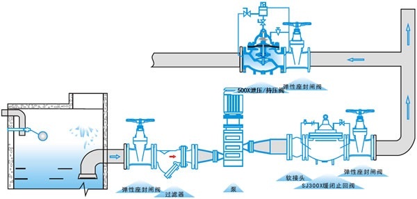 500X泄壓/持壓閥由主閥、泄壓/持壓導(dǎo)閥針閥、球閥、微形過濾器和壓力表組成水力控制接管系統(tǒng)。利用水力自動操作,即可以作泄壓閥用又可作持壓閥用。作泄壓閥用時,可維持供水路壓力在設(shè)定的安全值之下;做持壓閥用,可維持主閥上游水壓在設(shè)定值之上,保持主閥上游供水壓力。