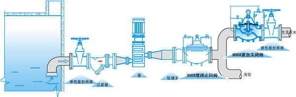 900X緊急關閉閥用于生活供水和消防供水并聯(lián)供水系統(tǒng)中,正常情況供生活用水,當火災發(fā)生時消防用水時,閥門自動關閉生活用水,確保足夠的消防用水。當消防停止用水時壓力減少,閥門自動恢復生活用水,該閥使系統(tǒng)無須另設專門的消防單獨供水管網(wǎng),大大地節(jié)省了工程建設成本和日常的用水量。該閥控制靈敏、可靠、調(diào)試簡單、使用壽命長。